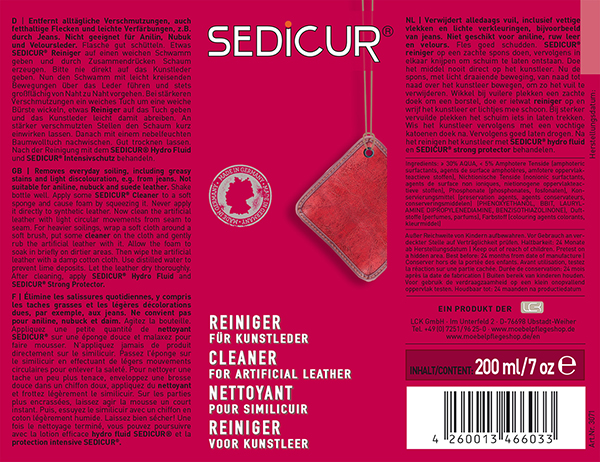 - Der SEDICUR Kunstleder Reiniger reinigt schonend, ohne die Oberfläche zu beschädigen